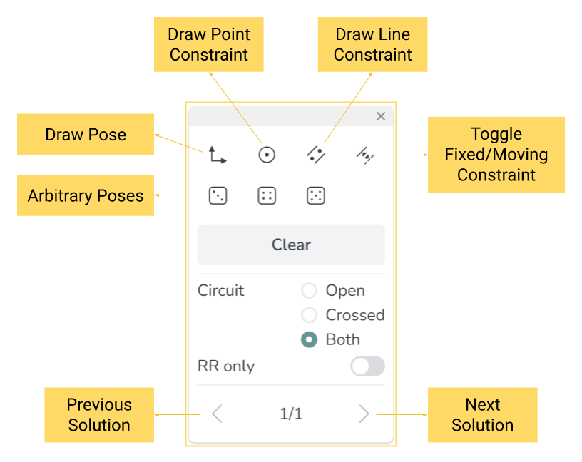 Draw four arbitrary poses and one line constraint: The line constraint is on the location of the fixed pivots. A plurality of line constraints can be specified to enlarge the solution space. The line constraint can also be toggled to the moving pivots.