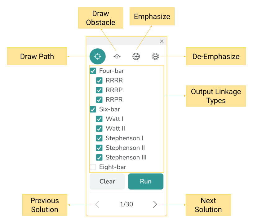 By drawing a path via Draw Path and pressing Run you can synthesize numerous solutions for a mechanism that follows that path.