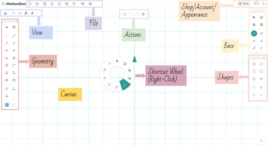 The Base panel shown on the right allows you to model a mechanism and simulate it. In this chapter, we will focus on this panel only.